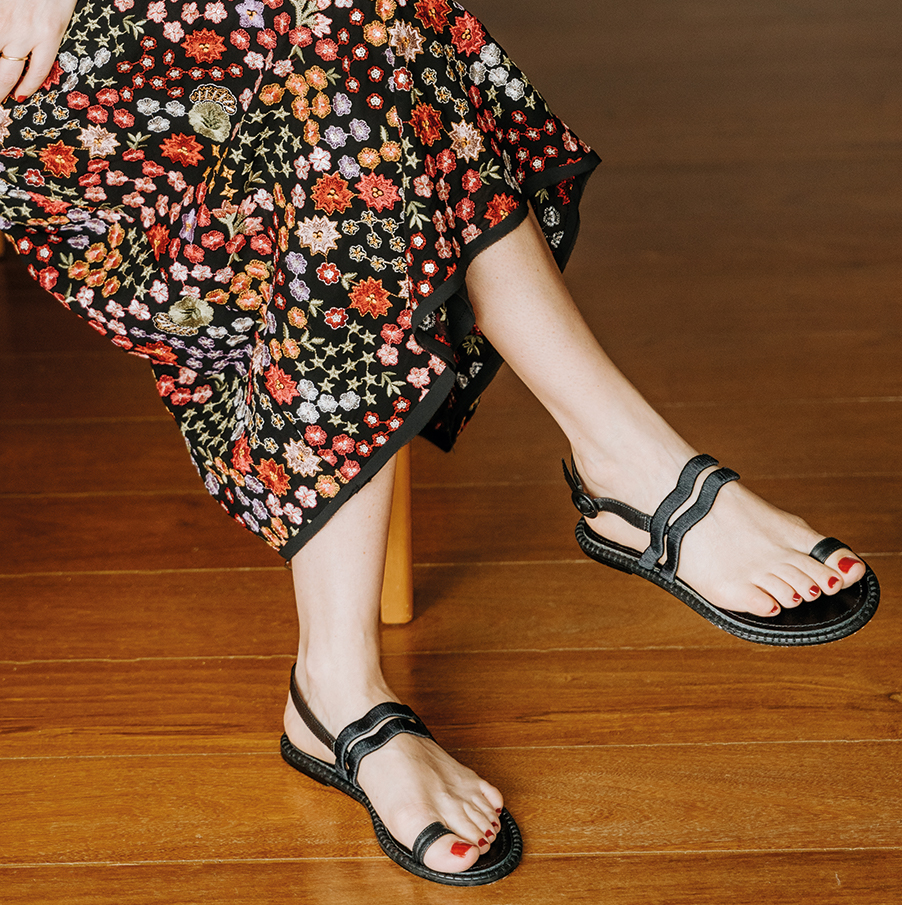 Rasteira confeccionada em couro preto com tiras bordadas em linha preta com fechamento por fivela forrada em couro preto. Forro em couro, palmilha em couro preto com vira bordada em ponto celeiro.