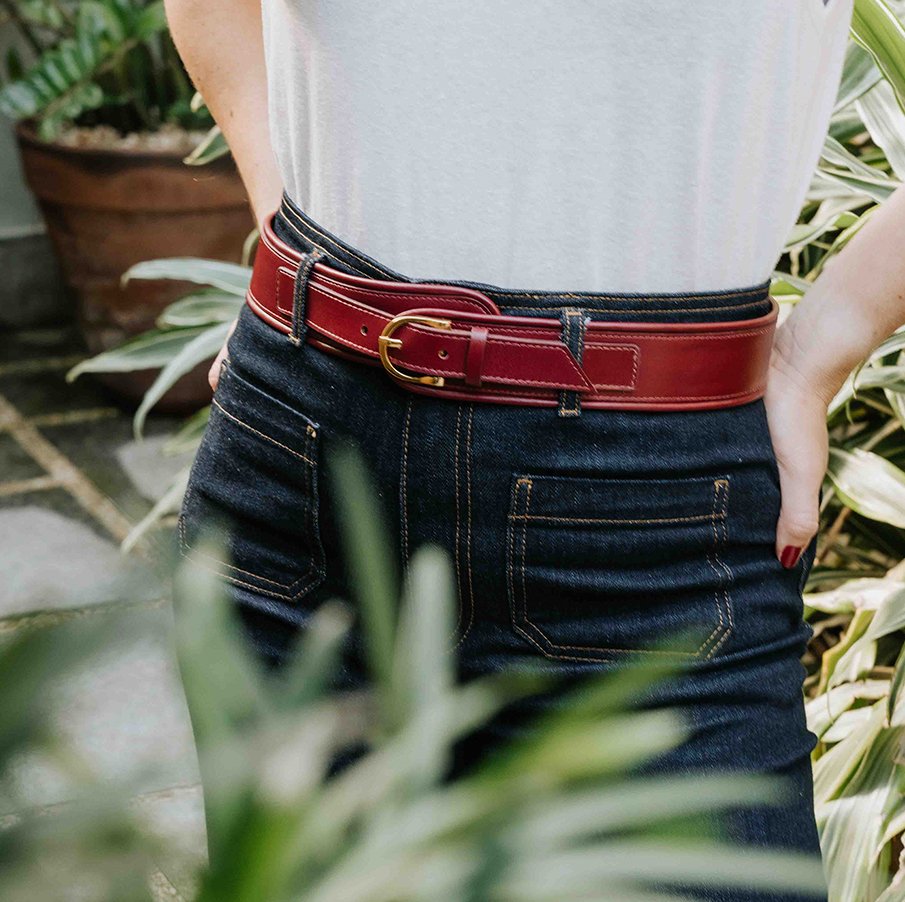 Cinto confeccionado todo em couro bordô e fivela de metal em banho dourado.