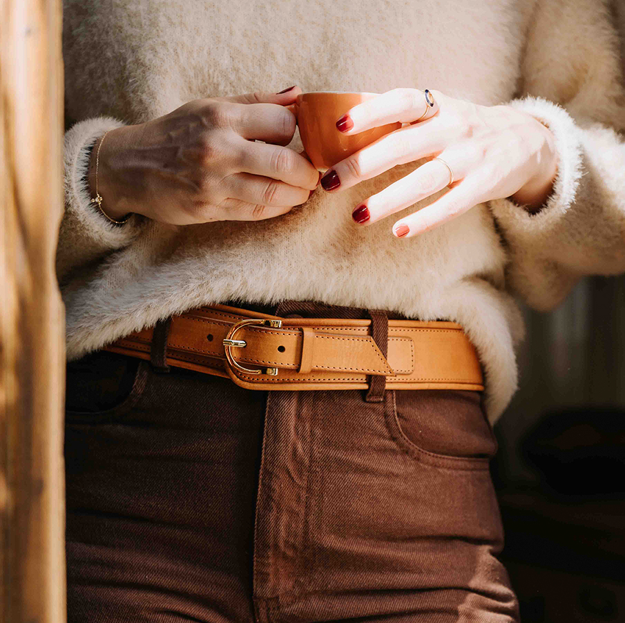 Cinto confeccionado todo em couro caramelo e fivela de metal em banho dourado.