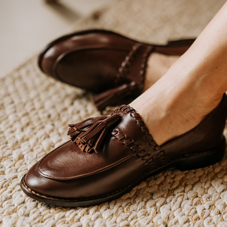 O Mocassim Antônia Café Anas é mais um sinônimo de conforto e charme. Todo em couro com toque charmoso do tassel e detalhe da gáspea e calcanhar em ráfia, fica ótimo com um look mais de trabalho ou com com uma produção mais descolada. Must-have da nossa nova coleção.