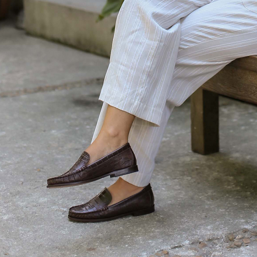 O Mocassim Rita Croco Café Anas é aquele clássico eterno. Todo em couro, fica ótimo com um look mais formal de trabalho ou com uma produção mais descolada. A proposta perfeita para os dias de outono.