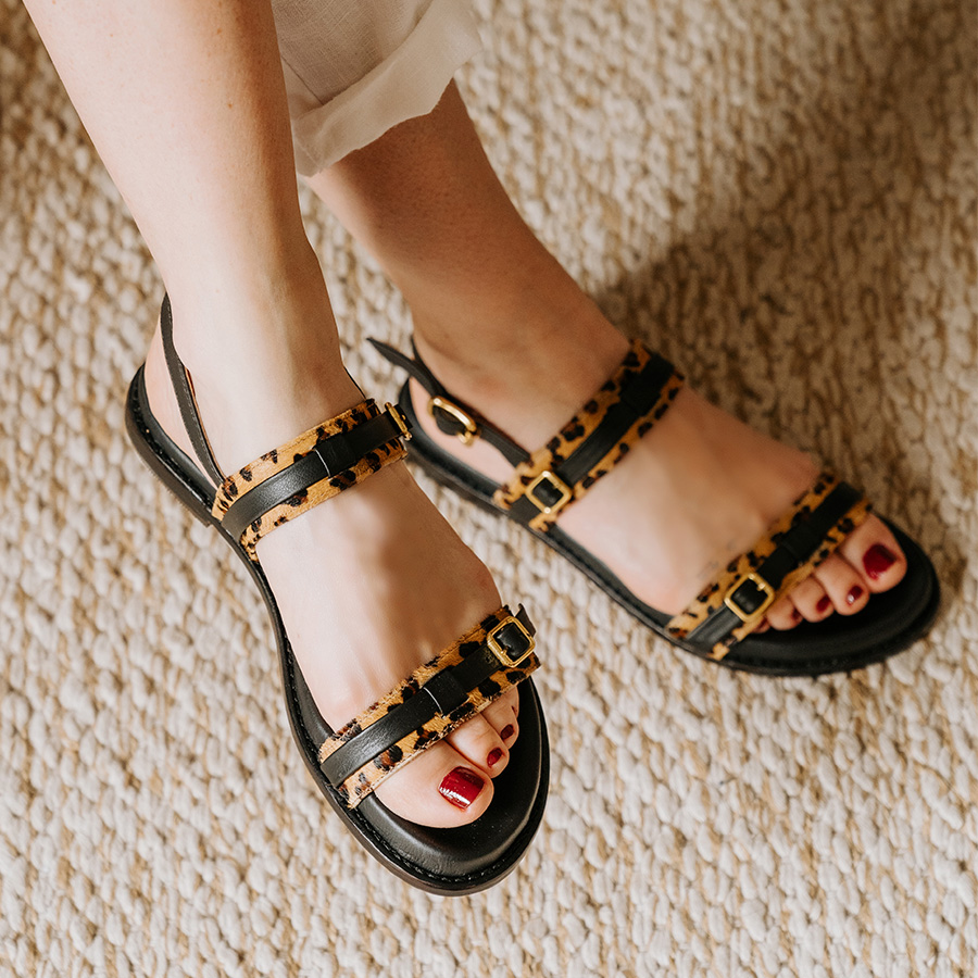Papete confeccionada em couro estampado de onça com fechamento por fivela. Tiras de couro preto sobreposta com fivela, forro em camurça, palmilha anatômica de couro e sola também em couro.