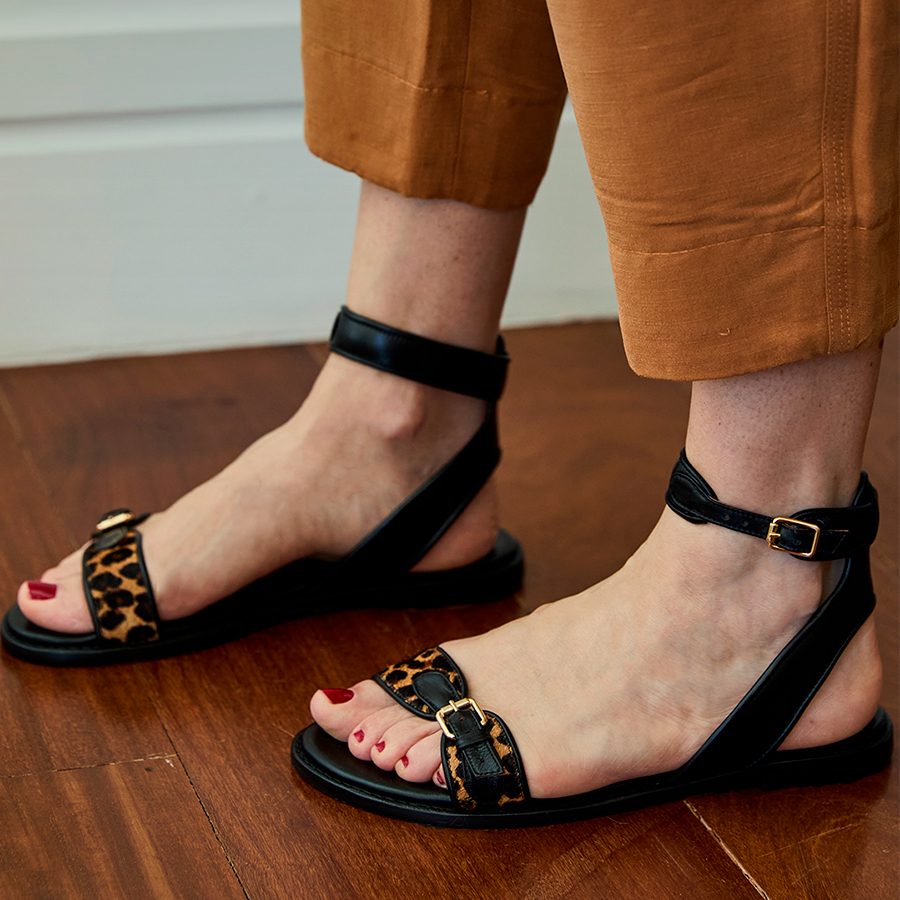 Rasteira confeccionada em couro preto e camurça com estampa de onça, possui fivela regulável nos dedos. Fechamento por fivela no tornozelo.