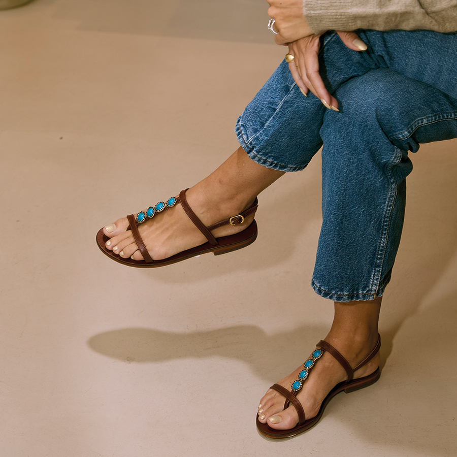 Rasteira confeccionada em couro caramelo com aplicação de resina na cor azul turquesa e strass verde esmeralda. Fechamento por fivela. Forro em camurça, palmilha e solado em couro.