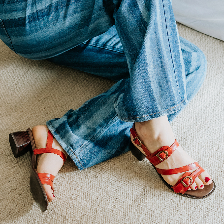 Sandália confeccionada em couro na cor vermelho telha, forrada em couro e salto de 5 cm. Fechamento por fivela dourada e tira regulavél no peito do pé.