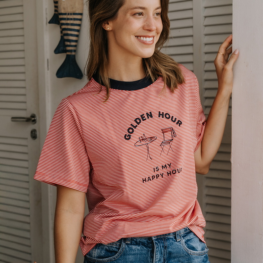 Novidade da nossa coleção de Verão, a T-shirt Golden Hour Listra Vermelha Anas é perfeita para te acompanhar nos dias de verão com clássico jeans ou para aqueles dias de praia com canga.